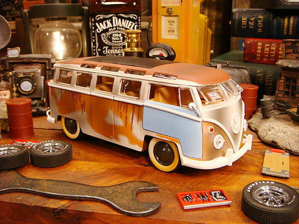 まるで映画のセットみたい!道路に放置され、錆びてヤレたボロボロのワーゲンバスをリアルに再現したダイキャストモデルカーです。 この手の世界って、これまでプラモが超うまい人だけが楽しめる究極の世界だったわけなんですよね!それがこうして手に入るんだから、あ?たまんない! しかも車種があのワーゲンバスと来たからには喜びも倍増って感じ!しかし、こんなの手の掛かるデザインをよくぞ製品化してくれました。 ボディは至るところが錆び、腐食して錆が垂れるところまで見事にペイントで再現!ガラスにヒビが入っていたり、後輪タイヤが1本だけ予備タイヤに変えられてたり、ドアがブッ壊れたのか、廃車のパーツを持ってきて取り付